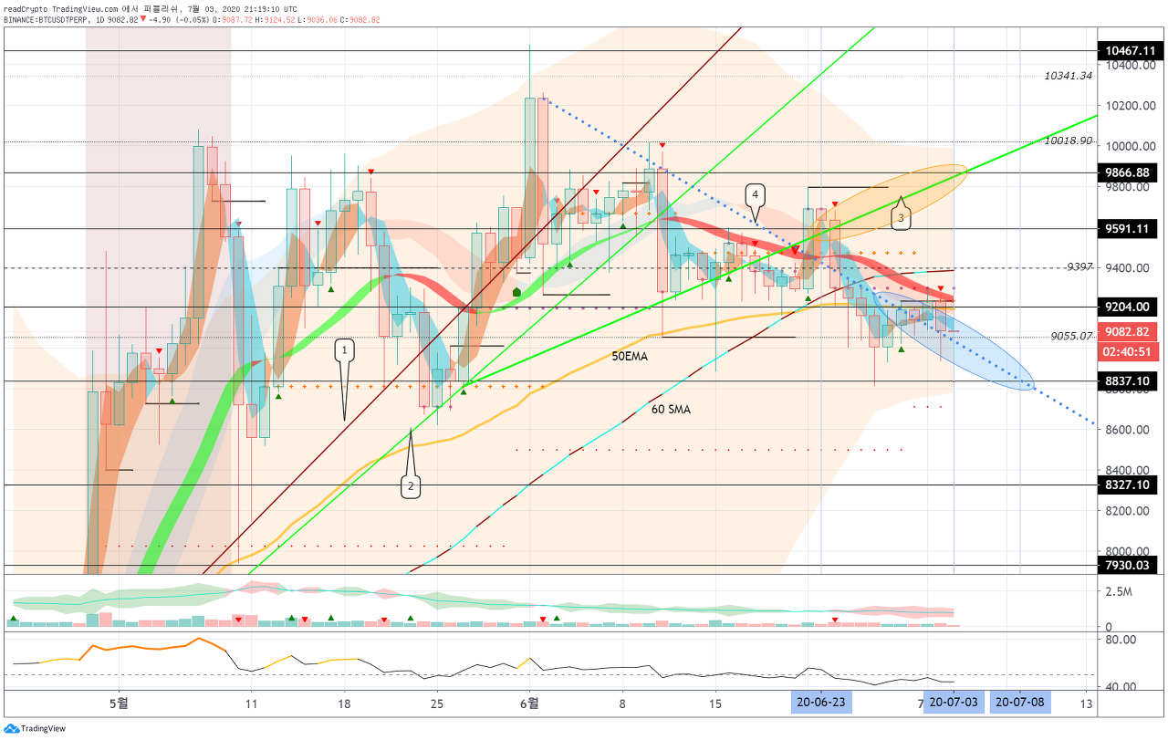 2K EMA에서 하락하게 된다면, 3K EMA 이하를 터치할 가능성이 있습니다.