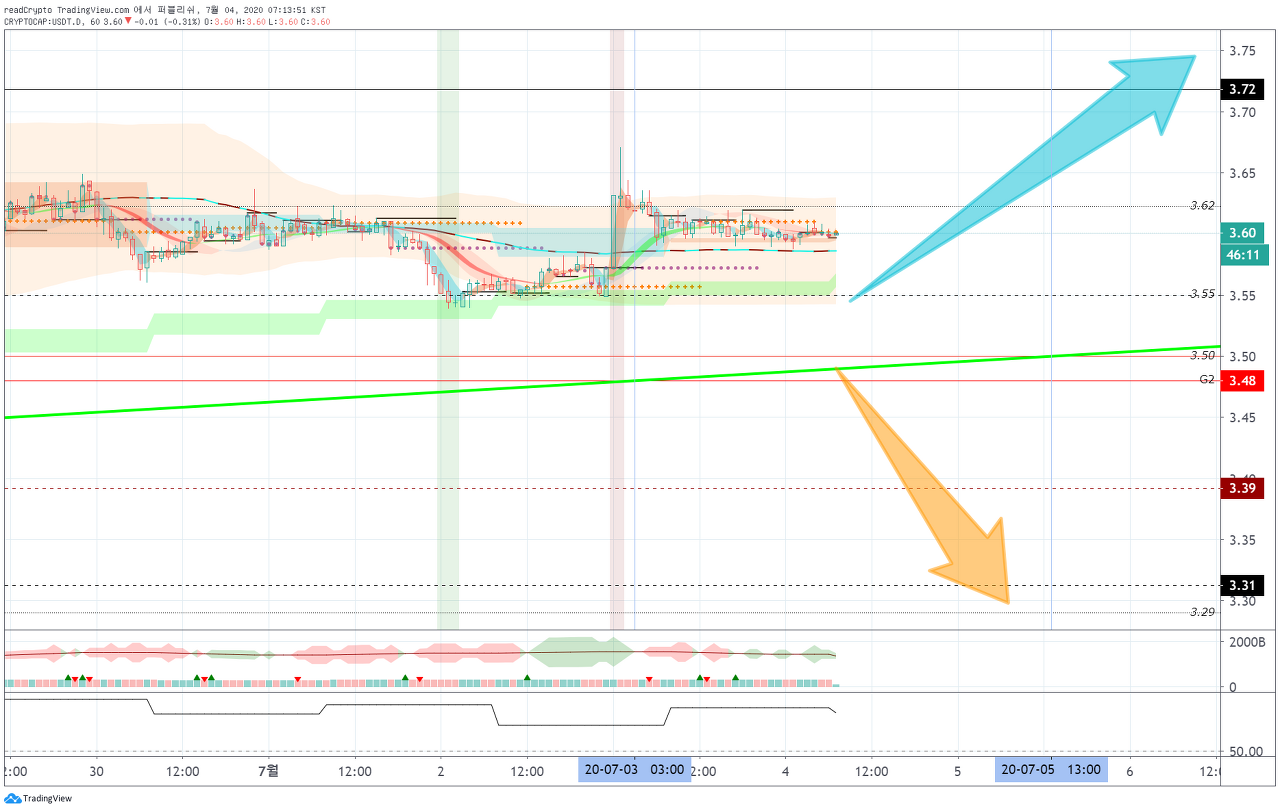 3.55~3.62 구간에서 sideways 중이지만, 7월 5일경에 가까워질수록 3.55 지점 이하로 하락하지 못한다면, 3.72 지점 이상 상승할 가능성이 있다고 생각합니다.