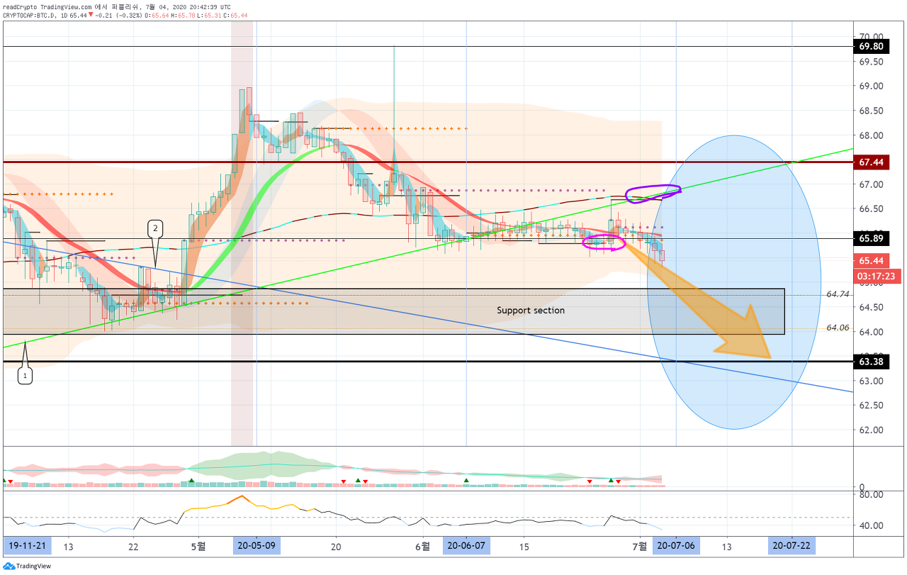 이에 따라서, 7월 6일~22일까지 BTC 도미넌스가 63.38 지점을 향하여 하락하게 된다면, 알트코인들의 강세가 예상됩니다.