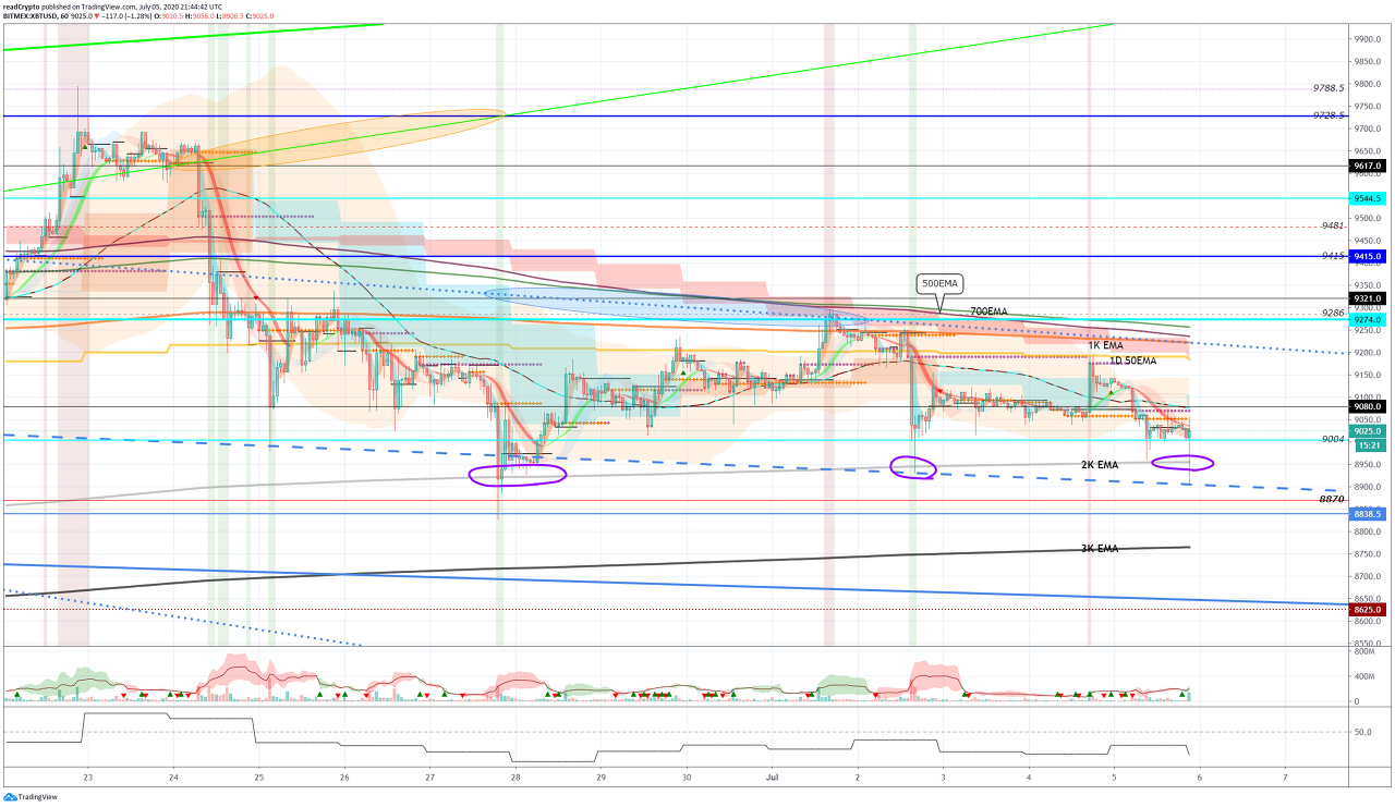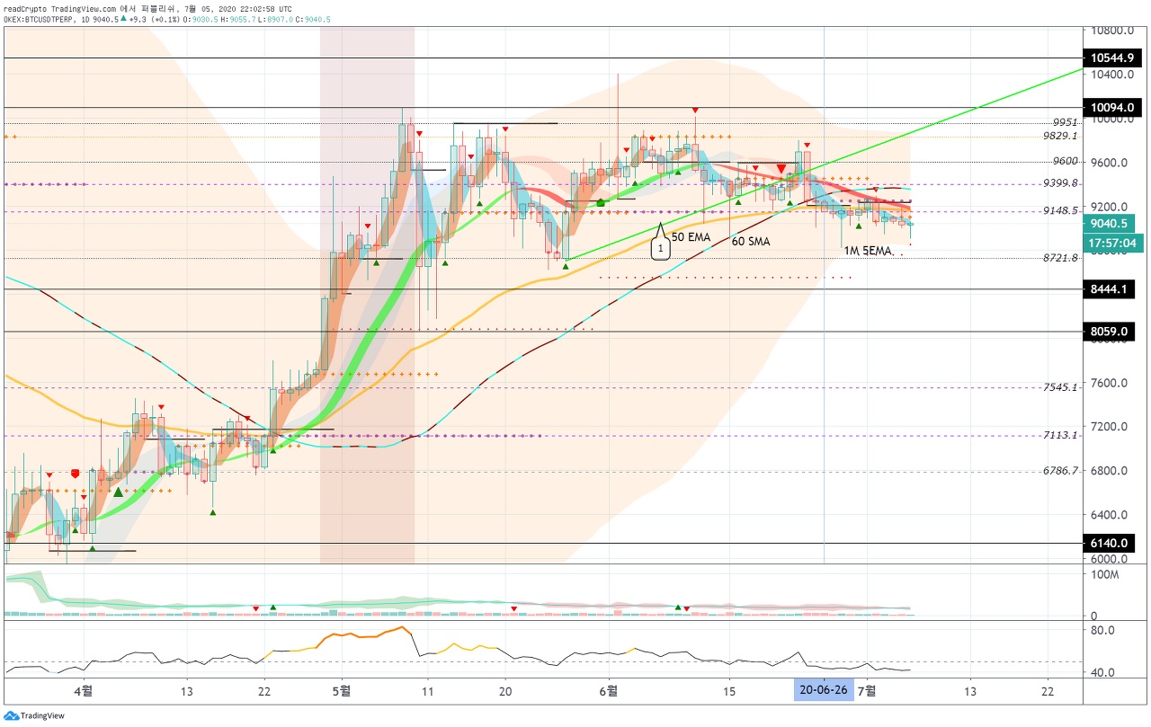 현재 9004 지점에서 지지를 받고 있지만, 9274 지점을 급격하게 터치하거나 서서히 2K EMA 이하로 하락하는 움직이 나올 가능성이 있다고 생각합니다.
