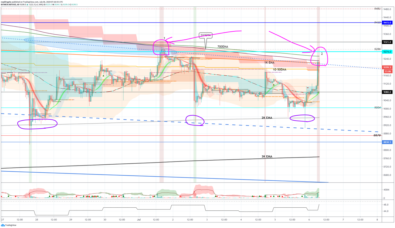 현재 9004 지점에서 지지를 받고 있지만, 9274 지점을 급격하게 터치하거나 서서히 2K EMA 이하로 하락하는 움직이 나올 가능성이 있다고 생각합니다.