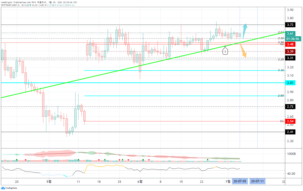 7월 5일경(7월 4일~6일)에 상승 추세선 (1) 이하로 하락할 수 있는지 확인이 필요합니다.