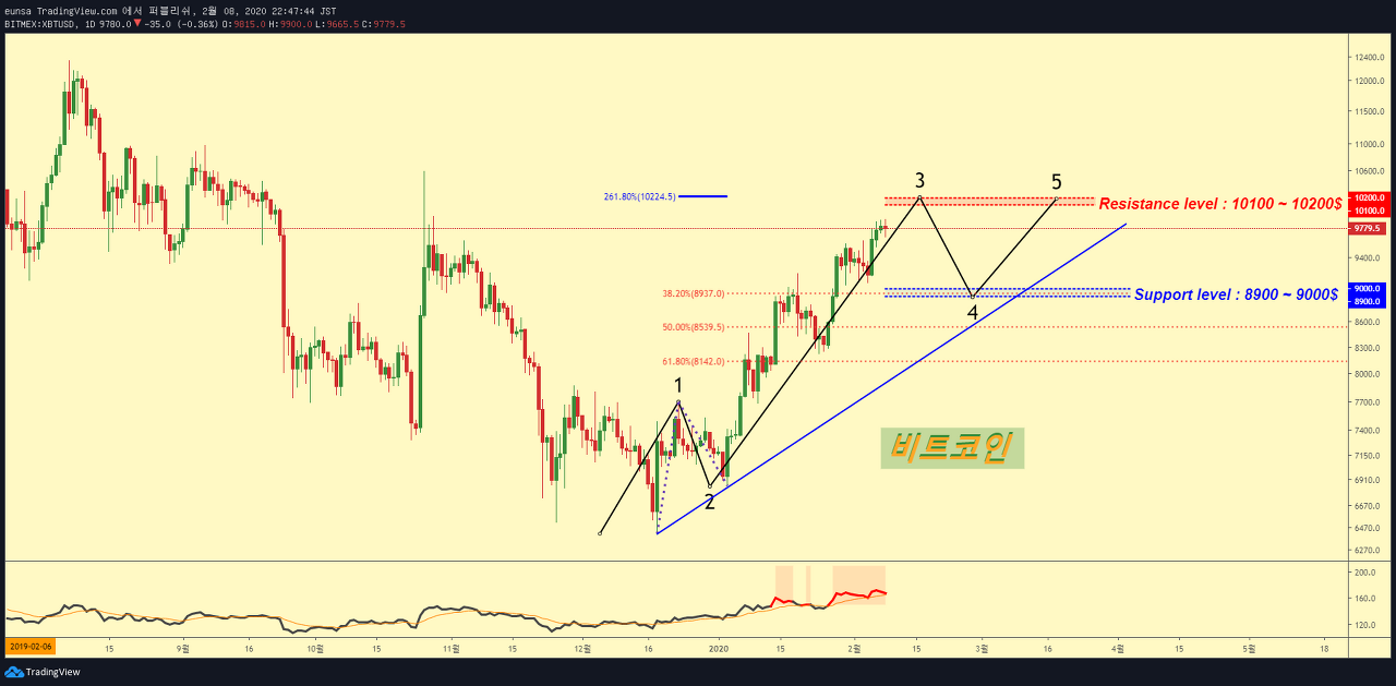 (2) 확장-2.618 3파동에 대해서 살펴보게 될 것이며, 그 값은 10200$ 근처로 보입니다