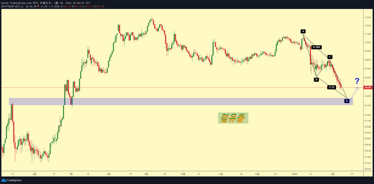 (2) 비트코인의 점유율이 기존의 하락A분과 동일한 비율로 하락한다면, 하락D지점에서 비트코인의 점유율이 다소 반등진행이 나오겠으며,