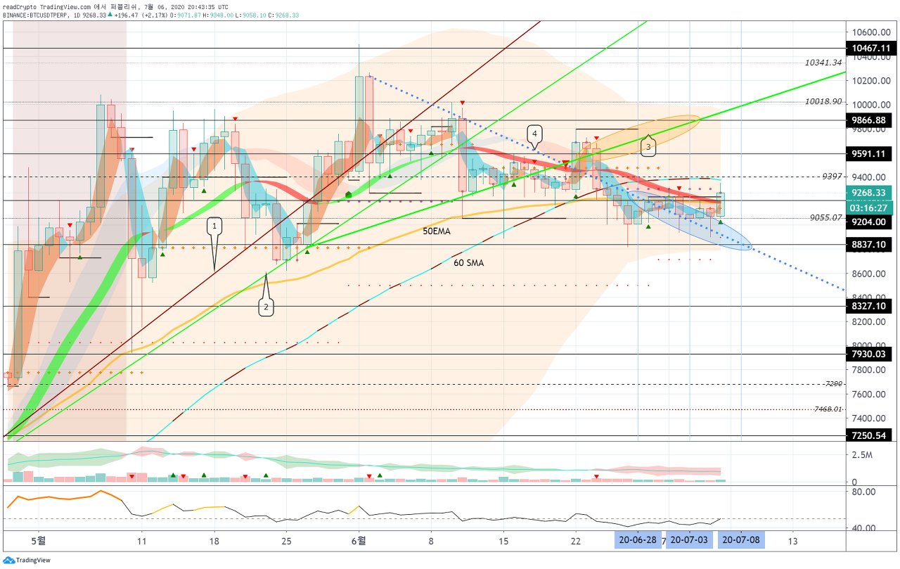 현재 시점에서 가장 중요한 것은 7월 7일경(7월 6일~8일) 까지 9209 지점과 하락 추세선 (3) 이상에서 지지를 받는 것 입니다.