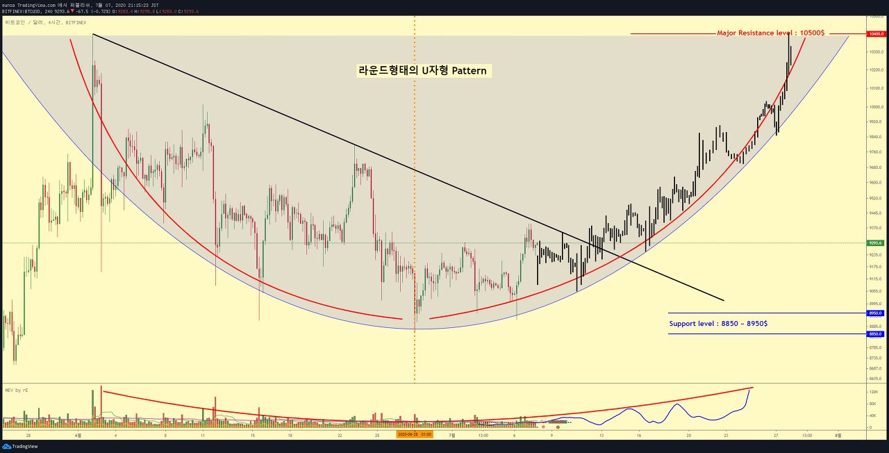 주요한 저항레벨의 넘어야 할 산이 많지만, 단기적인 지지레벨인 8850 ~ 8950$의 가격만 지탱해준다면
