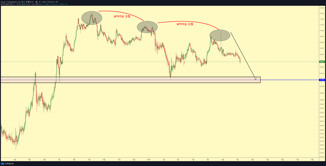지속적으로 비트코인 점유율의 고점이 하락할 경우, 점유율의 흐름이 알트코인쪽으로 넘어간다고 볼 수 있겠으며