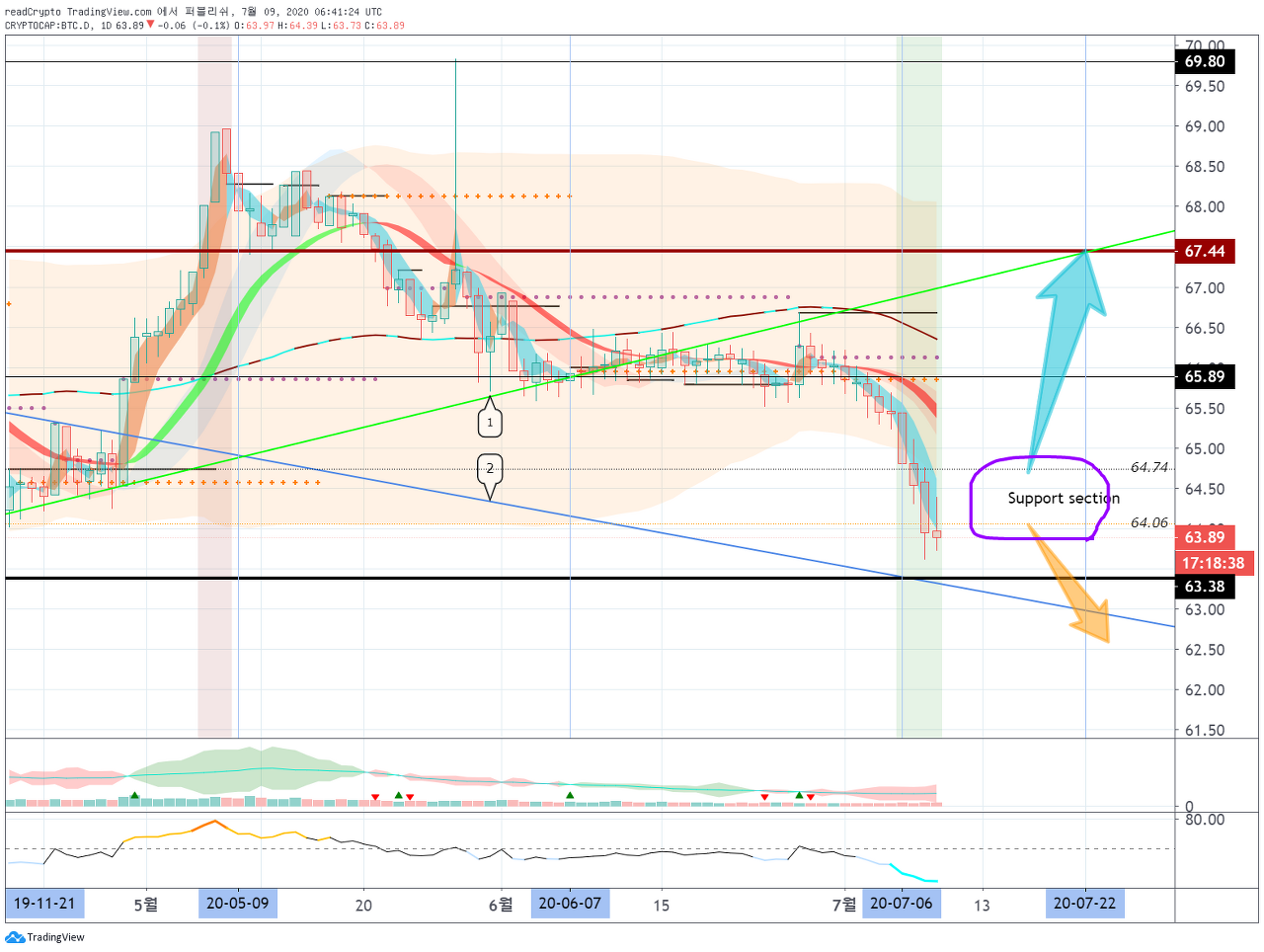 BTC 도미넌스는 64.06 지점에서 저항을 받고 하락 중 입니다.
