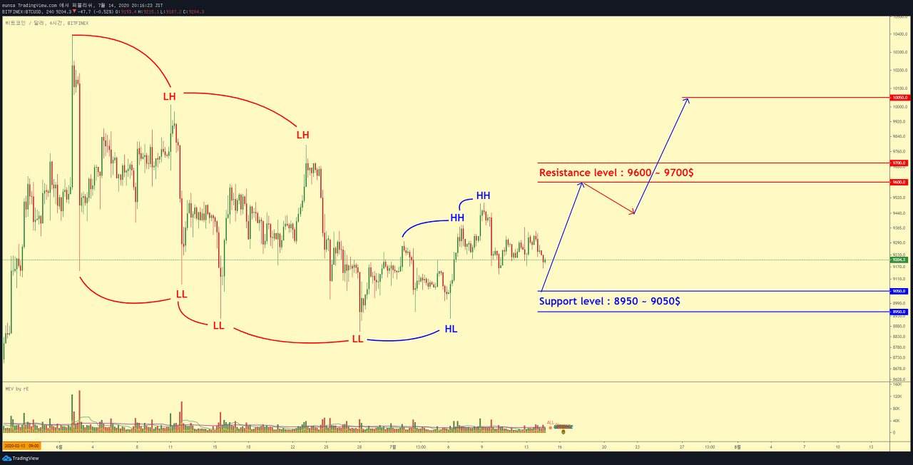 해당 상승파동의 지속하기 위해서는 Support level : 8,950 ~ 9050$ 사수가 관건이겠으며,