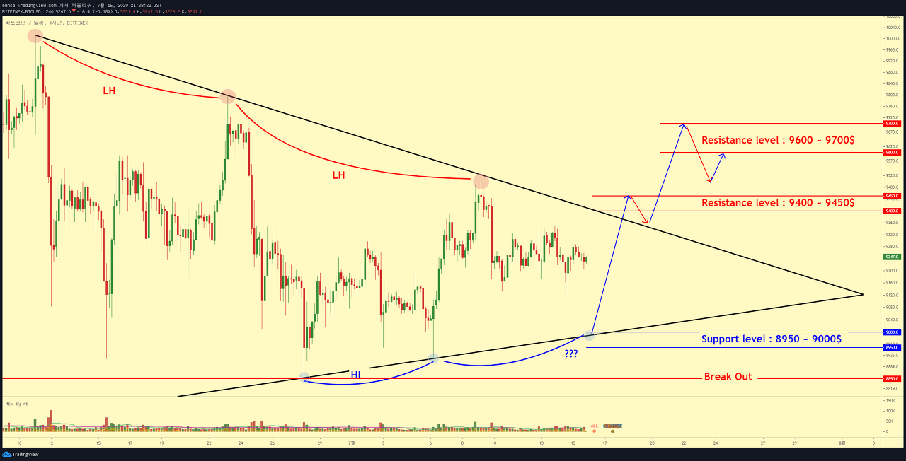 박스권 상방으로 돌파시에는. 9400 ~ 9450$ 부근에서 단기적인 조정이 가능한 저항영역이오며. 결국 핵심은 9600 ~ 9700$ 의 저항레벨을 뚫고 HH의 상승파동을 그려 낼 수 있겠는가 ? 그것이 핵심이겠습니다