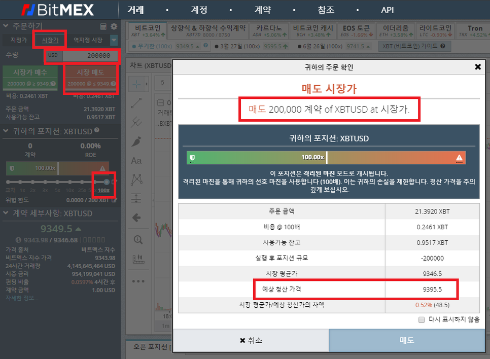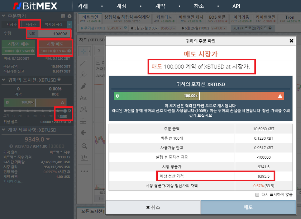 레버리지를 100배를 체크하고 하락할 것을 예상하여 매도(공매도)를 하셨다면 1%만 하락해도 2배의 수익을 얻지만