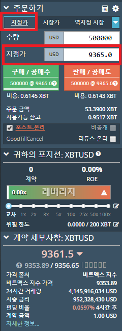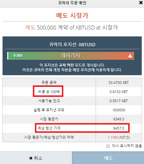 하지만 교차를 체크해서 하게 되면 본인이 가지고 있는 모~든 비트가(사용가능 잔고) 보증금이 된다고 보시면 됩니다.