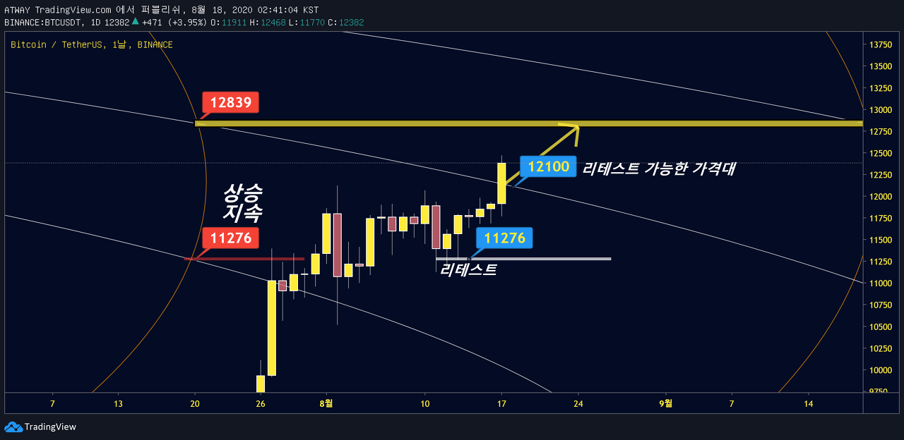 오늘 12100달러에 위치한 흰색선을 돌파해줬는데, 이 선은 저항이 아닌 지지선입니다.