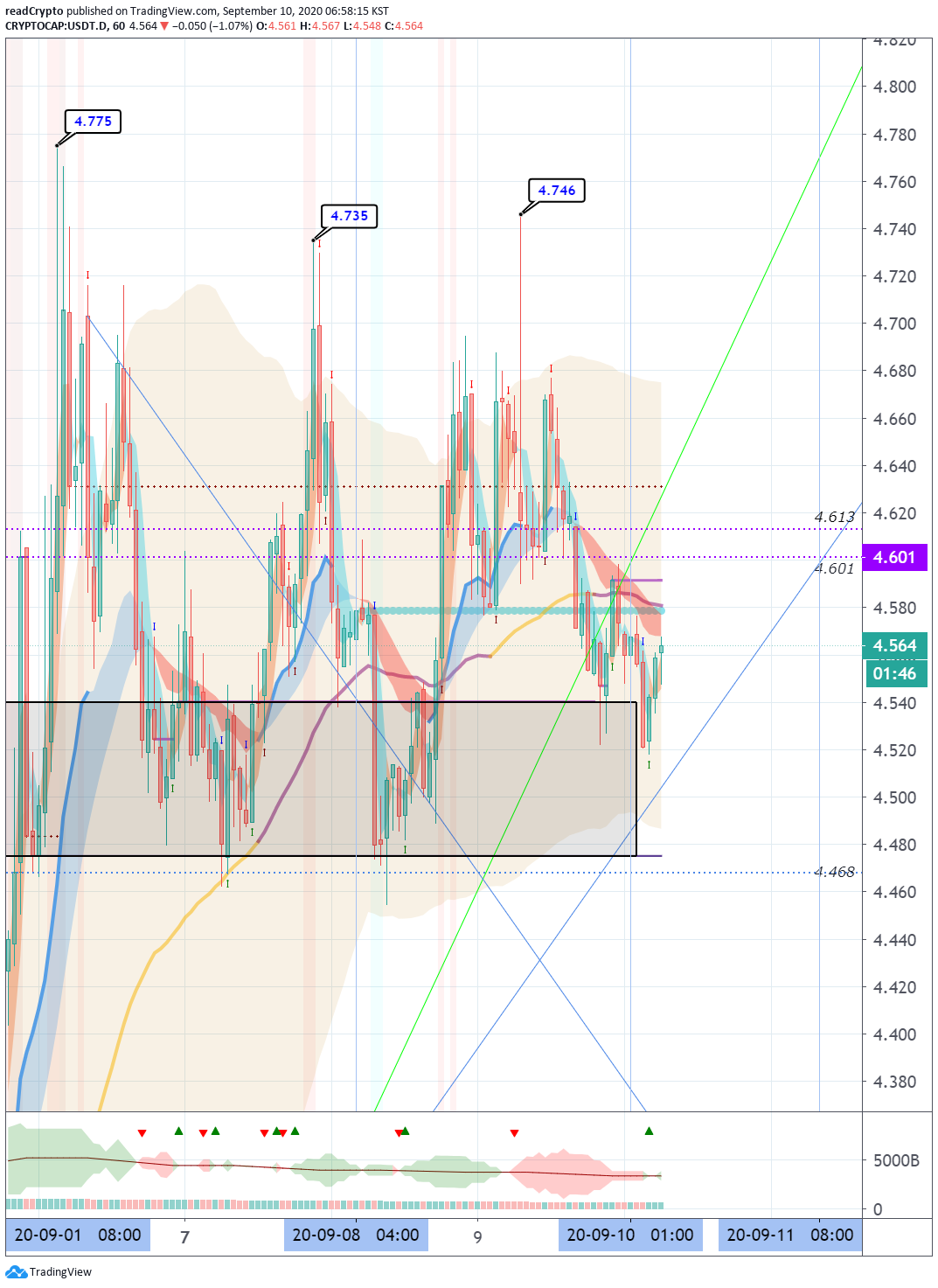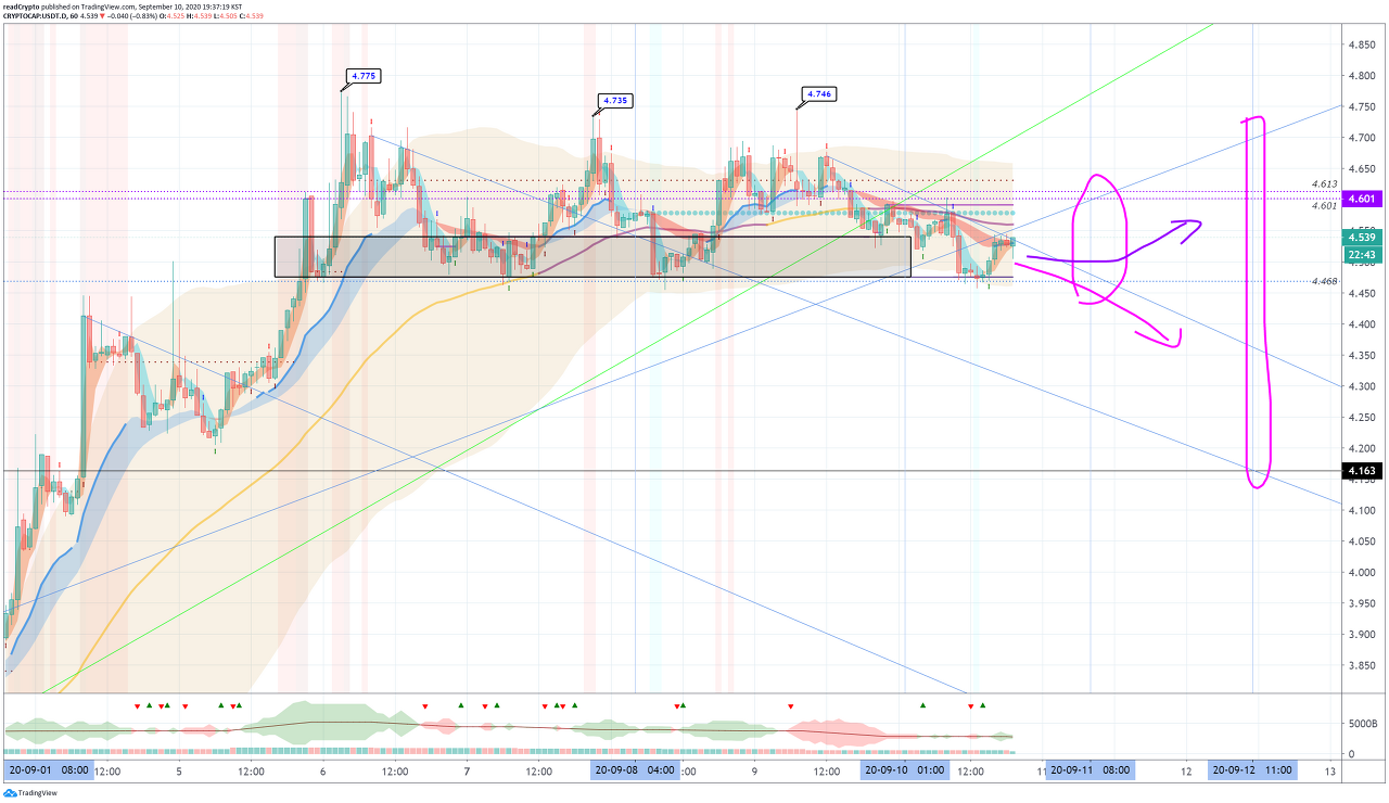 4.601 지점에서 저항을 받아서 4.468 지점 이하로 하락할 수 있는지 지켜봐야 합니다.