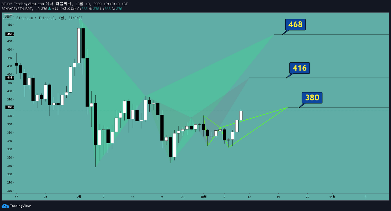 코멘트: 비트코인 크랩패턴 PRZ가 11427$, 이더리움도 작은 하모닉패턴에서 PRZ가 375$ 전후였습니다. 비트가 11500대후반까지 간다면 이더리움도 단기 눌림이 380대부터 나올것입니다.