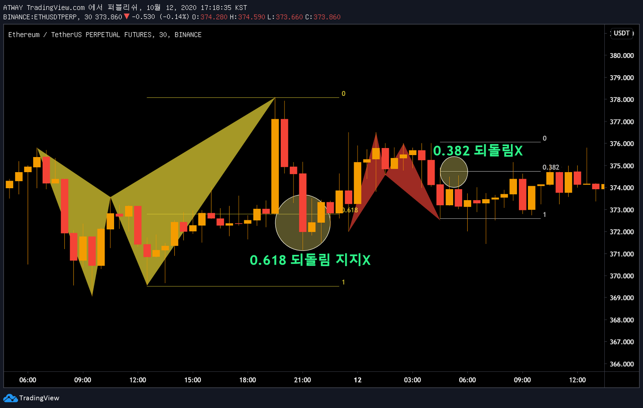두번째 하모닉패턴이 완성됐을 때도 반등이 0.382 를 넘지 못하였습니다.