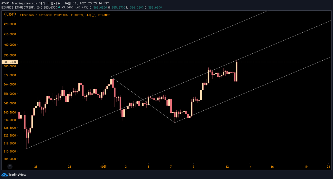 375달러를 확정이탈한 뒤 이 자리에서 지지를 받는다면 추가상승에 대하여 다시 낙관적인 기대를 해볼 수 있을 것이라고 생각합니다.