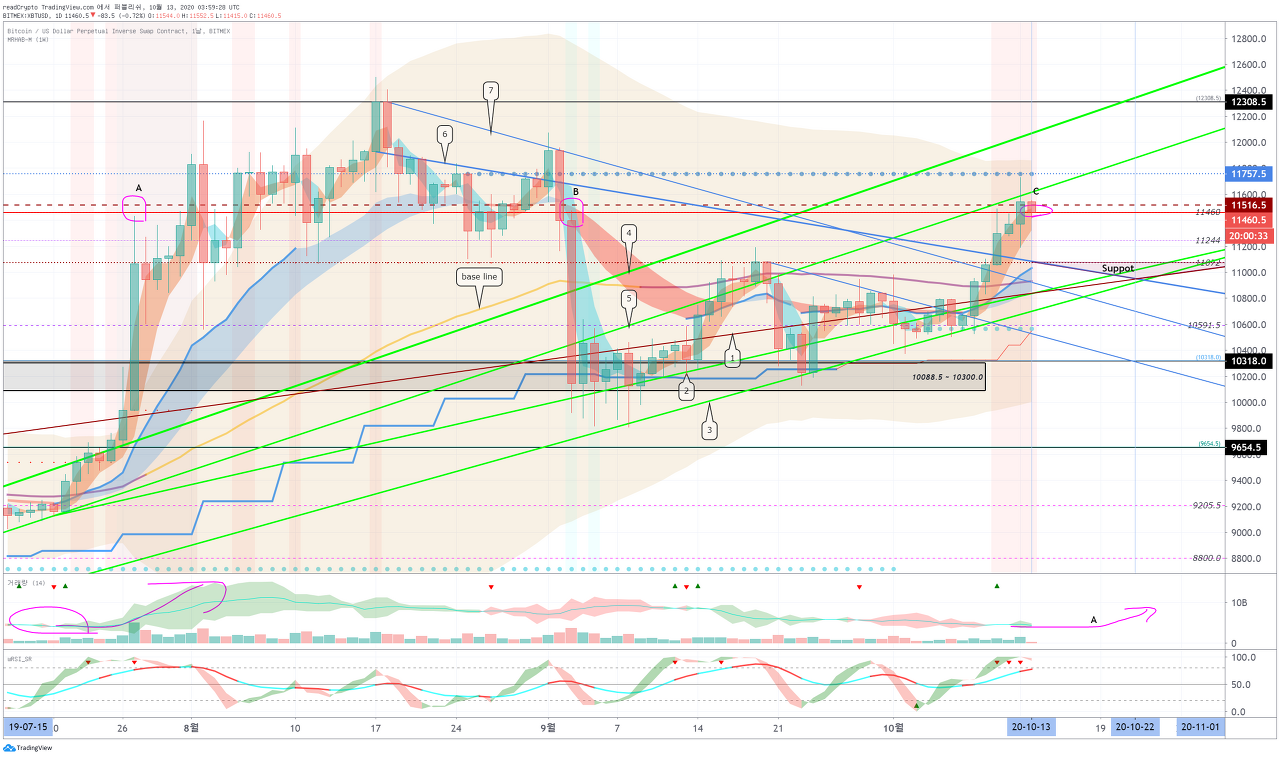 A 캔들의 High, B 캔들의 High, C 부근의 11460.0 지점과 11516.5 지점에서 지지를 받으면서 가격을 유지할 수 있는지 확인해야 합니다.