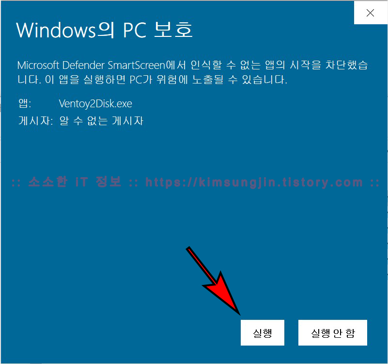 2. 압축 해제한 Ventoy 폴더에서 Ventoy2Disk.exe를 실행합니다. 실행 중 "Windows의 PC 보호" 창이 뜨는데요, 여기서 "추가 정보"를 클릭합니다. ▼