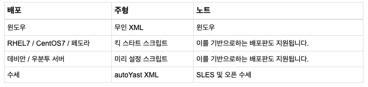 5. 무인 설치를 지원합니다. 무인 설치는 초보자 분들께서는 어렵지만, 어느 정도 고급 사용자분들께는 많은 도움이 될 것입니다. 아래는 지원되는 배포판입니다.