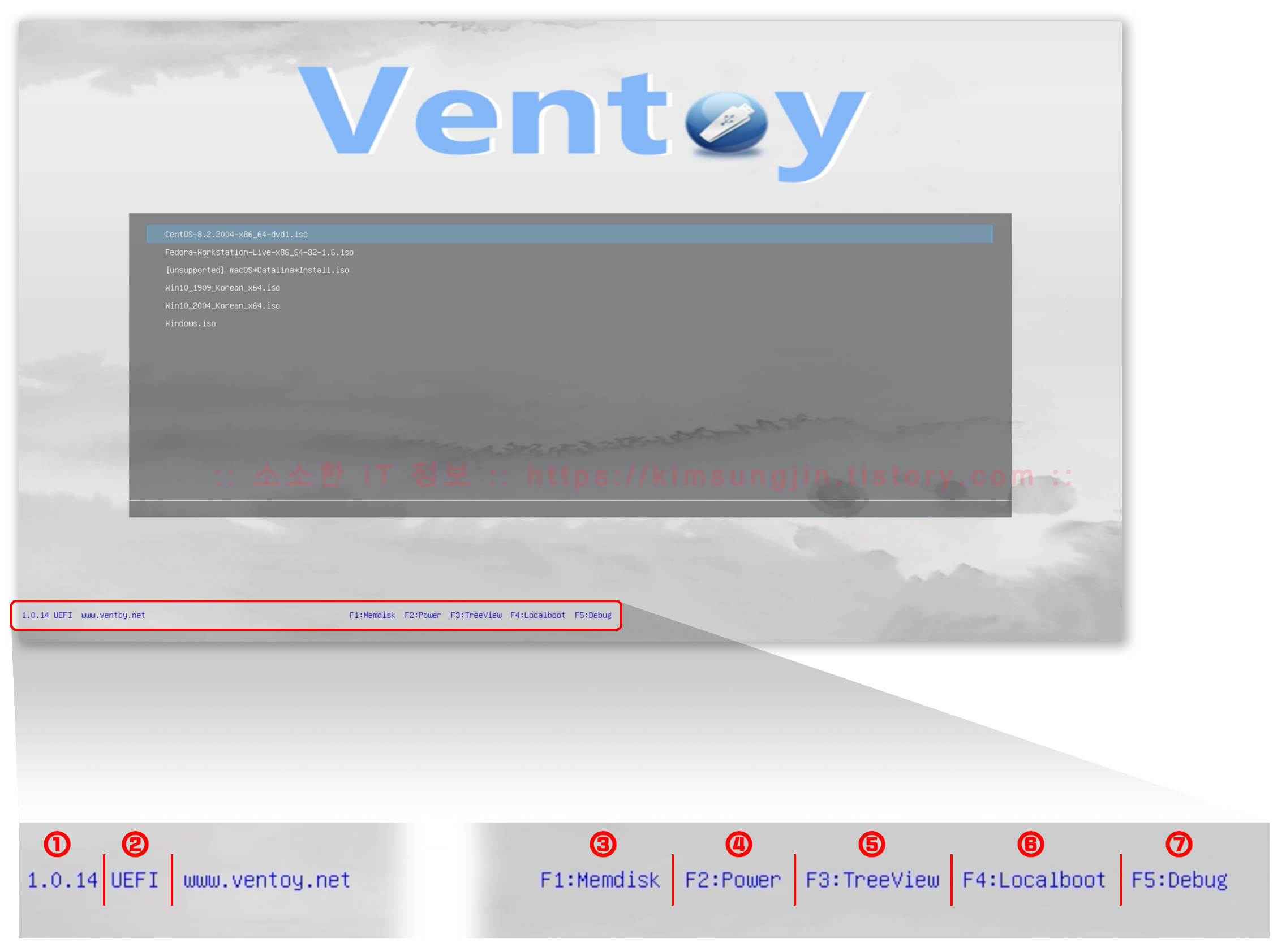 Ventoy 메인 화면의 하단에 몇 가지 추가 기능이 있습니다. 1.0.14 버전을 기준으로 2개의 정보 제공과 5개의 기능을 제공하고 있습니다. 이 부분도 자세히 살펴보겠습니다.