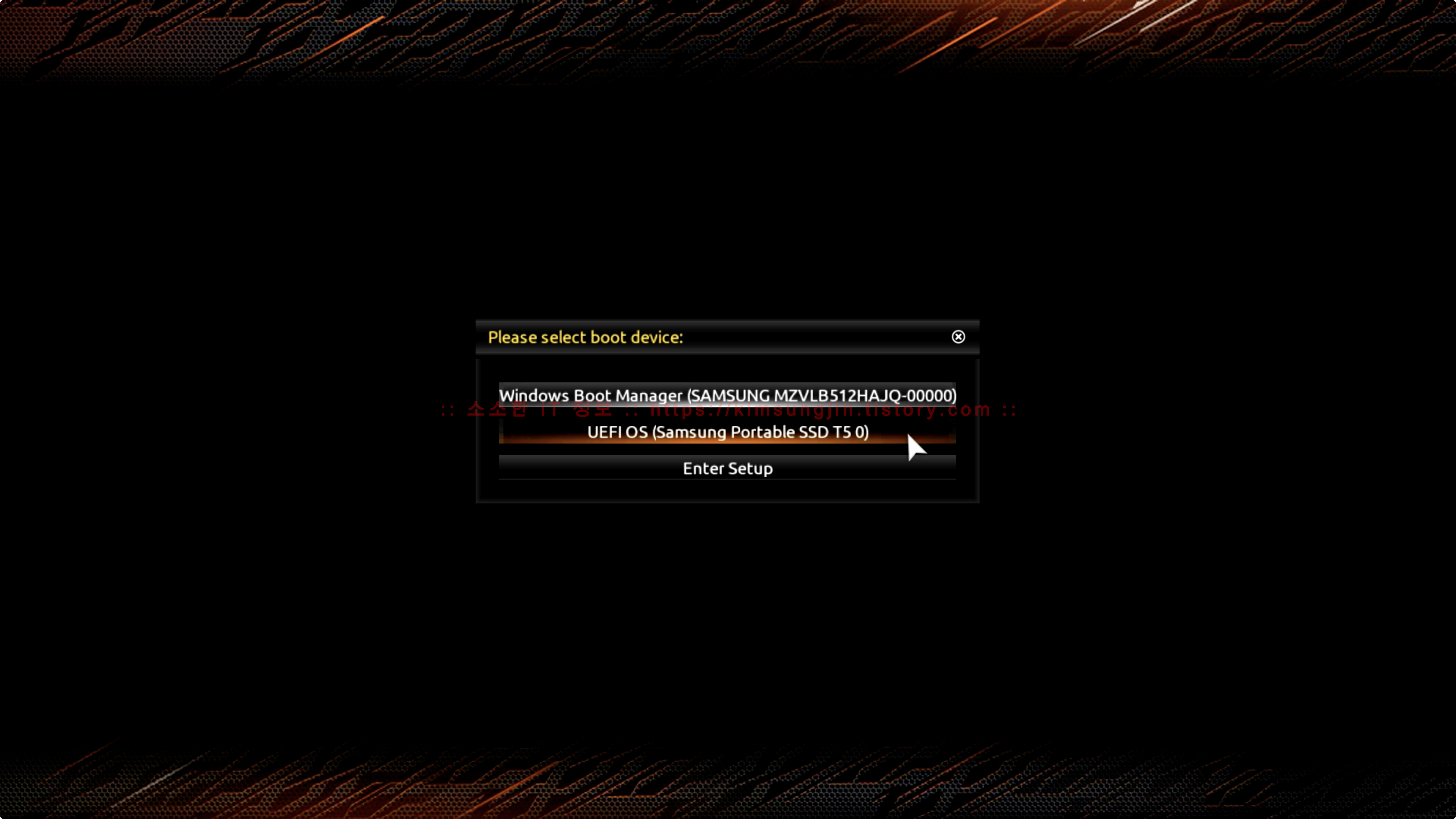 대부분의 조립 PC는 전원 인가 후 또는 재부팅 후 F12 키를 연속으로 누르게 되면 "부팅 메뉴"가 뜨는데, 일회성으로 부팅 순서를 변경할 때 BIOS(UEFI)에 진입하여 변경할 필요도 없고, 운영체제 설치 완료 후 부팅 순서를 원래대로 변경할 필요도 없기 때문에 주로 이 메뉴를 호출해 사용합니다. 브랜드 PC의 경우 제조사별로 틀릴 뿐만 아니라 제조일, BIOS 종류와 버전 등에 따라 다양하기 때문에 해당 PC 모델명으로 "BIOS 부팅 순서 변경" 또는 "부팅 메뉴"에 대해 검색해보시길 바랍니다. 아래 캡처는 Gigabyte x570 Aorus Master 메인보드에서 F12 키로 호출한 "부팅 메뉴"입니다. 만들어 놓은 Ventoy USB가 부팅 장치-UEFI OS (Samsung Portable SSD T5 0)-에 보일 것입니다. 저는 Samsung Portable SSD T5이므로 이것을 선택하도록 하겠습니다. ▼