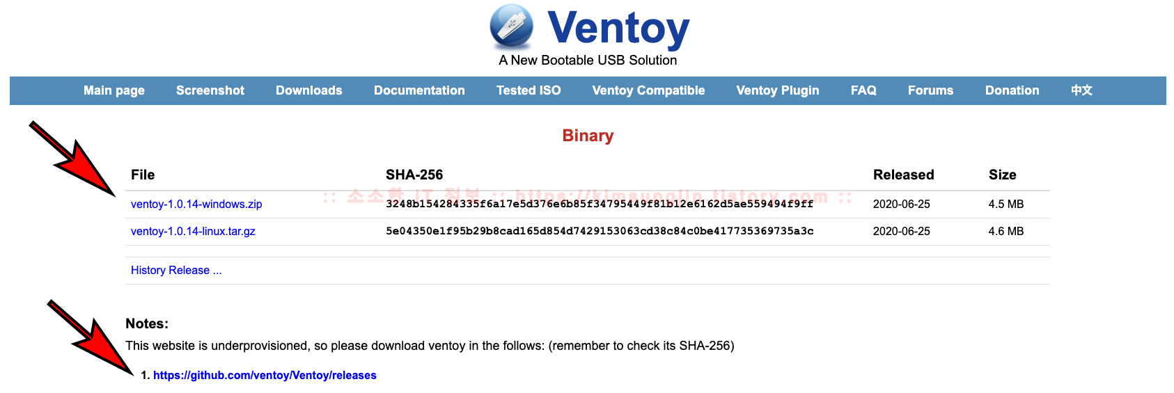 ✅ Ventory 다운로드 먼저 Ventoy를 다운로드 받아 보겠습니다. 파일 용량도 상당히 가볍습니다. 현재 최신 1.0.14 버전을 기준, Windows 버전이 약 4.5MB이고, Linux 버전이 약 4.6MB입니다. 아래 링크를 클릭하면 다운로드 페이지로 연결됩니다. 공식 페이지에서 직접 배포하는 것은 아니고, github.com을 통해 배포하기 때문에 한번 더 링크를 타고 들어가야 합니다.