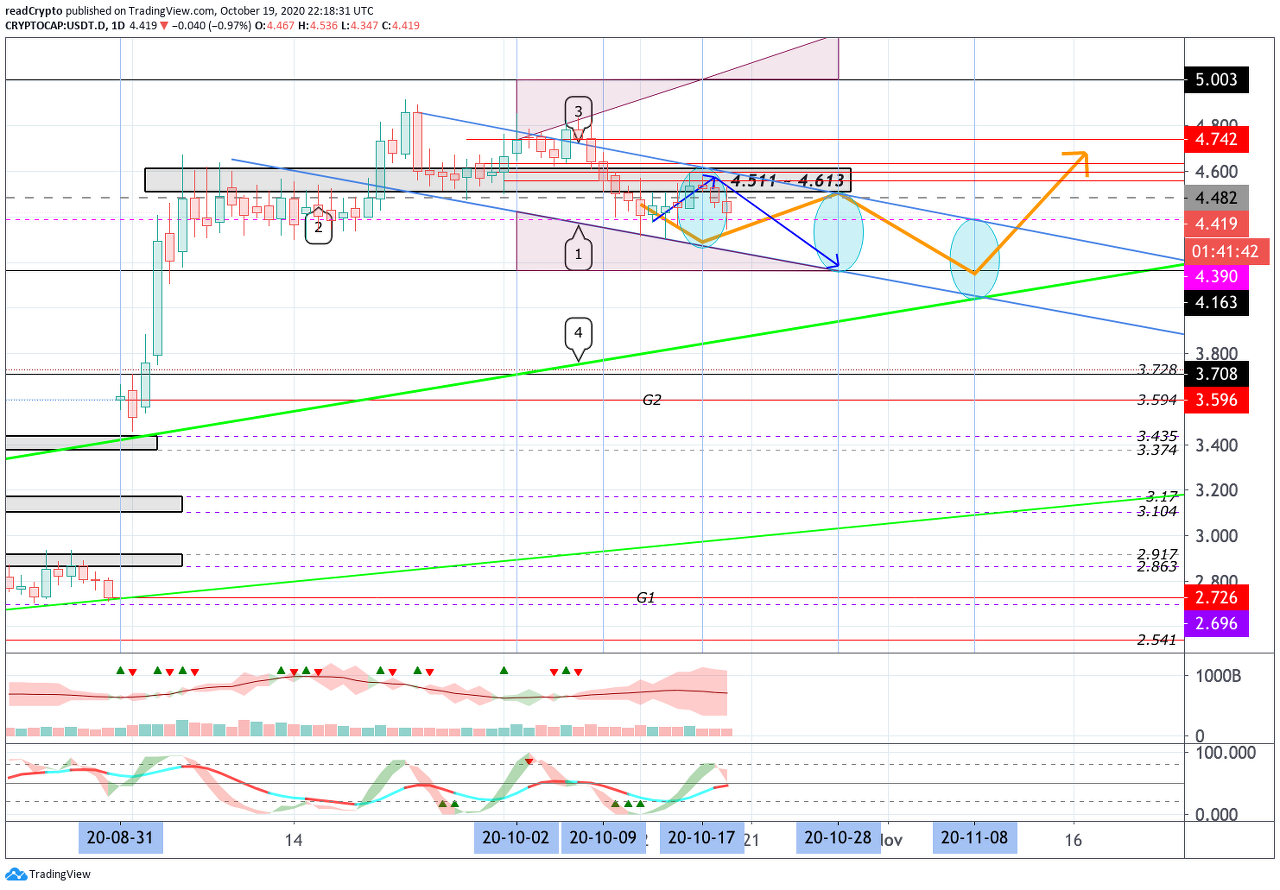4.390 지점 이하로 하락하여 하락 추세선 (1)을 터치할 수 있는지 지켜봐야 합니다.