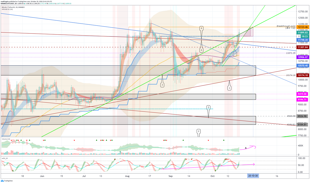 돌파 지점인 12123.46 지점을 상향 돌파하고, 알트코인들이 상승할 수 있는 시간을 주는지 확인해야 합니다.