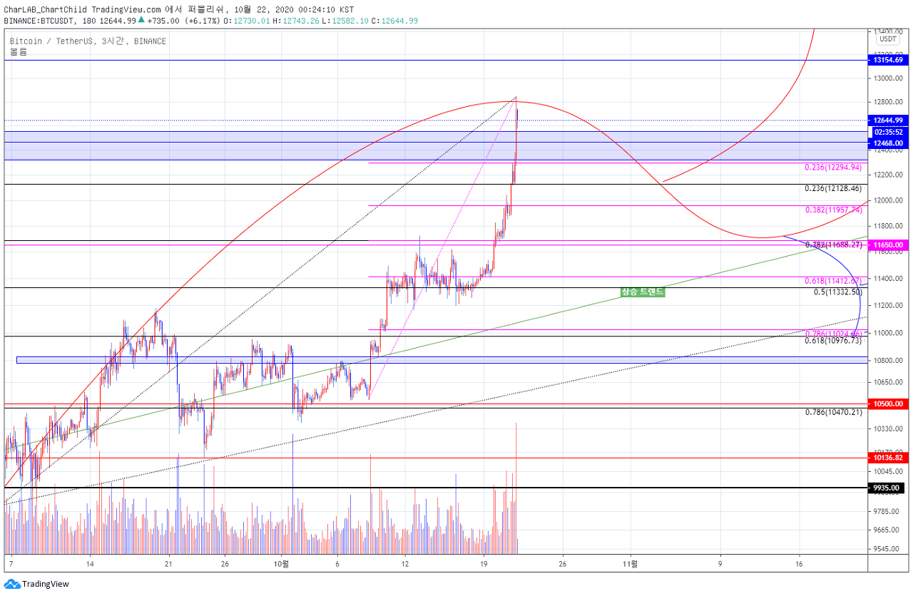 12500선에서 고점을 형성하던 BTC가 12시 전 한차례 더 상승하면서 12880선까지 상승을 하게되었는데 (이를 오늘 슈팅을 포함한 고점영역대로 해석하는 중입니다.)