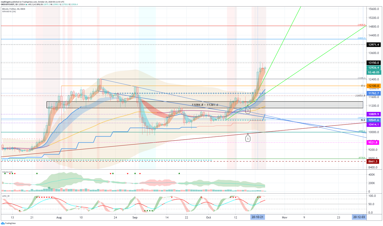 이전 고점인 13150.0 지점과 13971.4 지점을 상향 돌파할 수 있는지 지켜봐야 합니다.