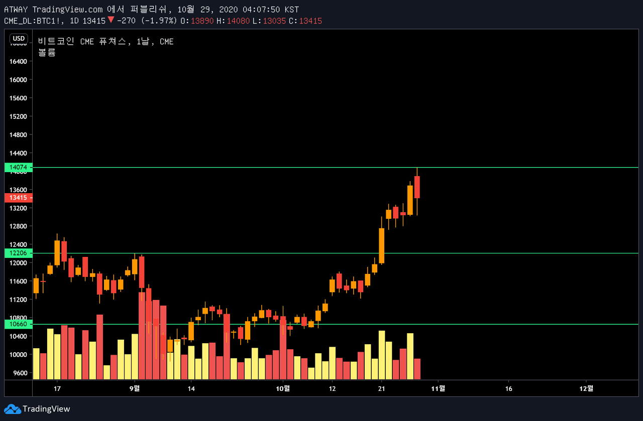 4개 거래소 모두 당시에 13K 중반대가 거래량이 피크를 찍은 지점으로 나옵니다. CME는 14K 정도로 나오는데 현물가 대비 프리미엄이 붙은 가격이라 현물기준으로는 13K 중반으로 봐도 될 것입니다.
