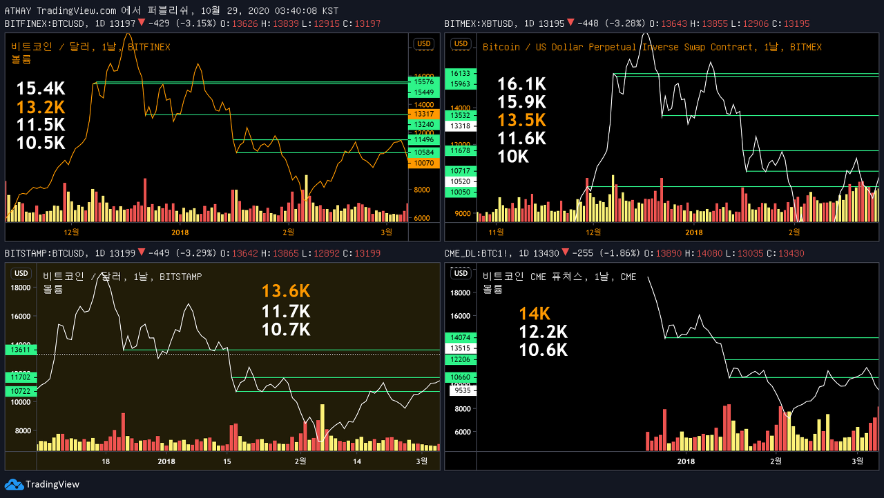 4개 거래소 모두 당시에 13K 중반대가 거래량이 피크를 찍은 지점으로 나옵니다. CME는 14K 정도로 나오는데 현물가 대비 프리미엄이 붙은 가격이라 현물기준으로는 13K 중반으로 봐도 될 것입니다.