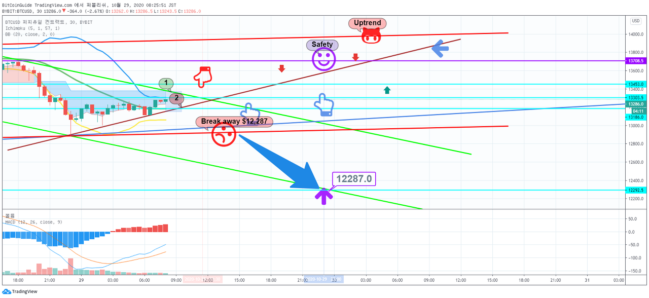 하단에 빨간색 지지선 이탈시 , 12287불까지 하락위험있습니다.