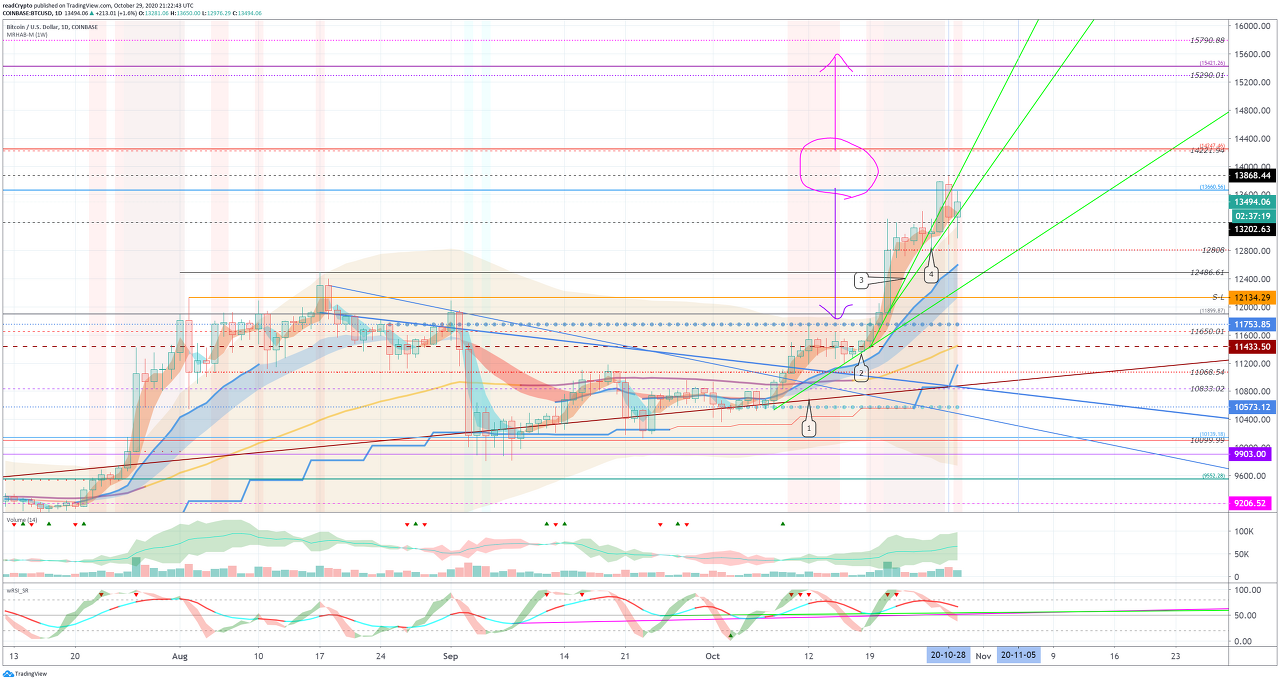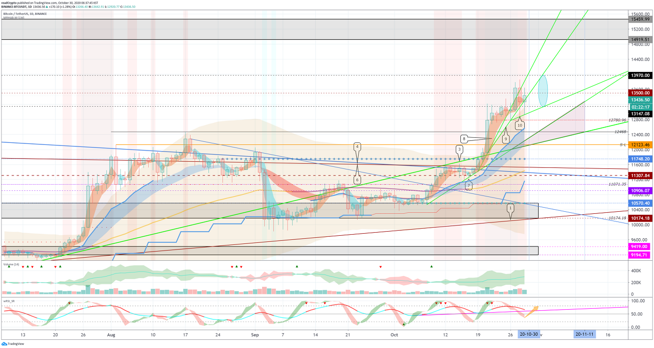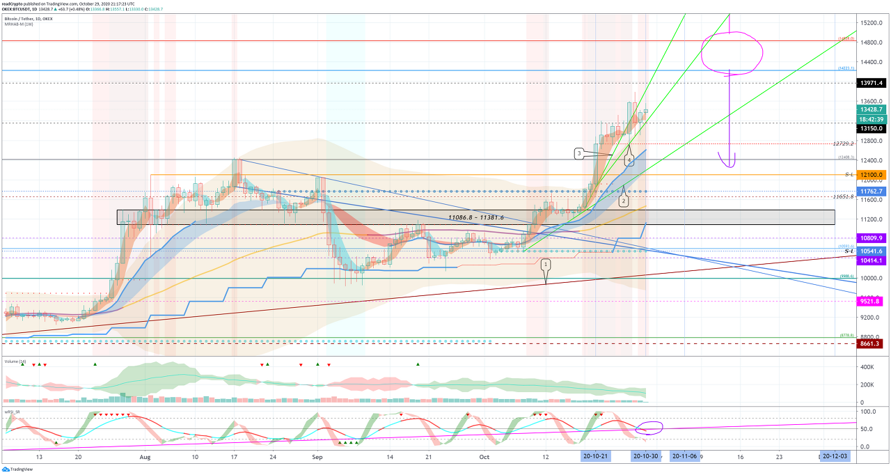 10월 30일경 (10월 29일-31일)의 변동성으로 12780.96-13970.0 구간에서 벗어나는 움직임이 나올 수 있는지 지켜봐야 합니다.