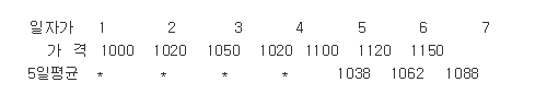5일 이동평균선을 구해보면 5일간 이동평균값을 더해서 5로 나눈값으로 (1000+1020+1050+1020+1100)/5 = 1038이 됩니다.이렇게 5일의 평균을 점으로 이은것이 '5일 이평선'이 되는겁니다.