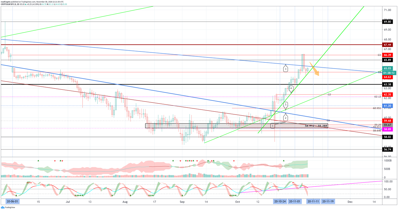 64.63-하락 추세선 (3) 사이에서 벗어나는 움직임이 나오는지 확인해야 합니다.