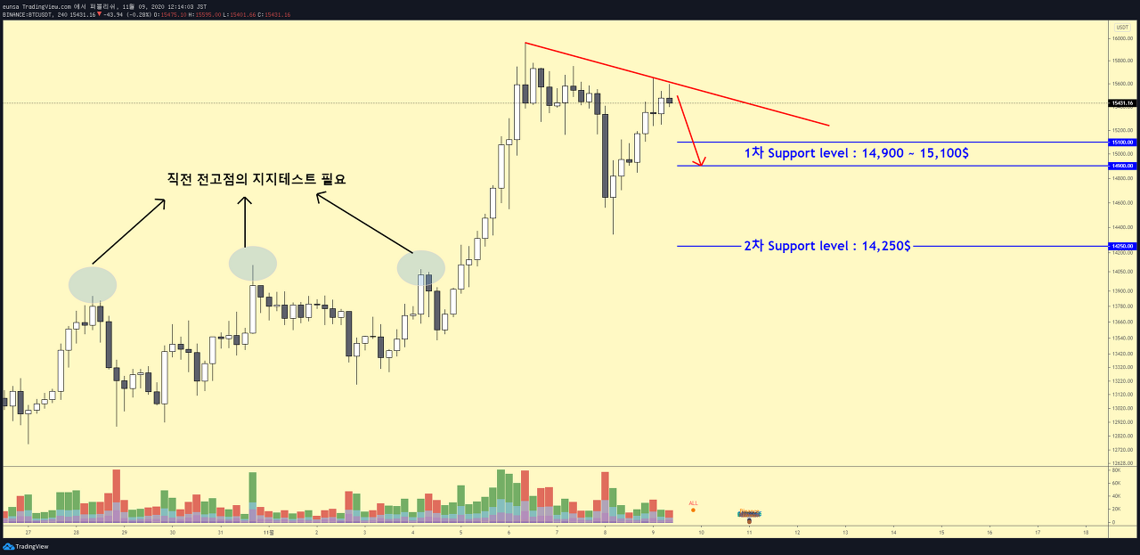 조정이 다소 강하게 나온다면, 2차 지지레벨인 14,250$까지 흐름도 고려해보셔야 겠습니다