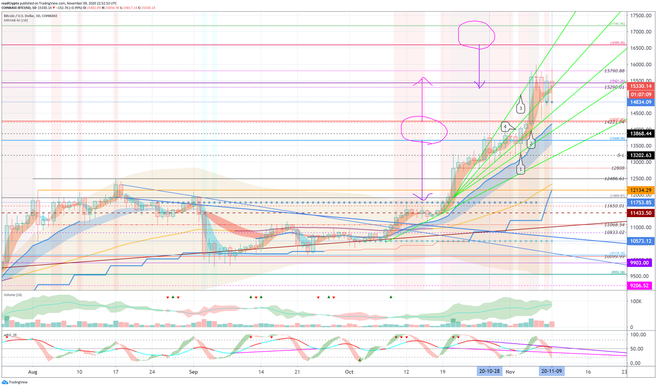 11월 9일경 (11월 8일-10일)의 변동성으로 14834.09-1570.88 구간에서 벗어나는 움직임이 나오는지 확인해야 합니다.