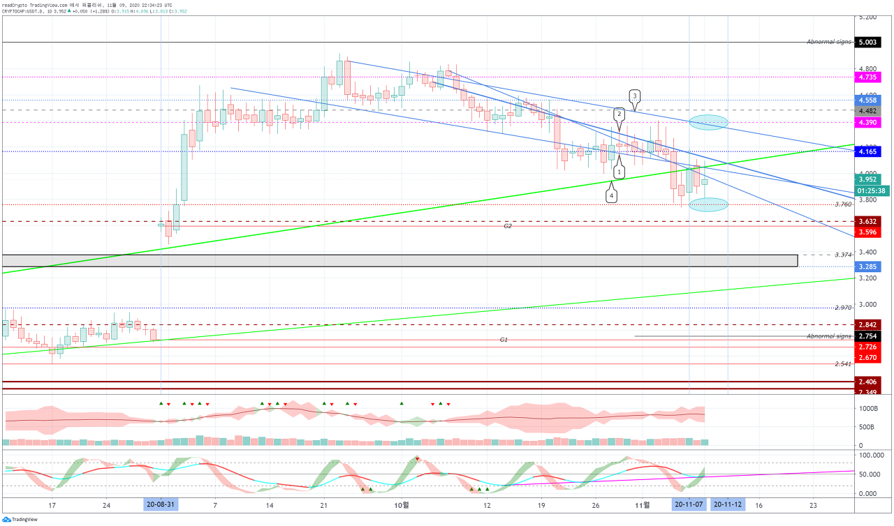 11월 7일-12일 사이에 3.760-4.390 구간에서 벗어나는 움직임이 나오는지 확인해야 합니다.