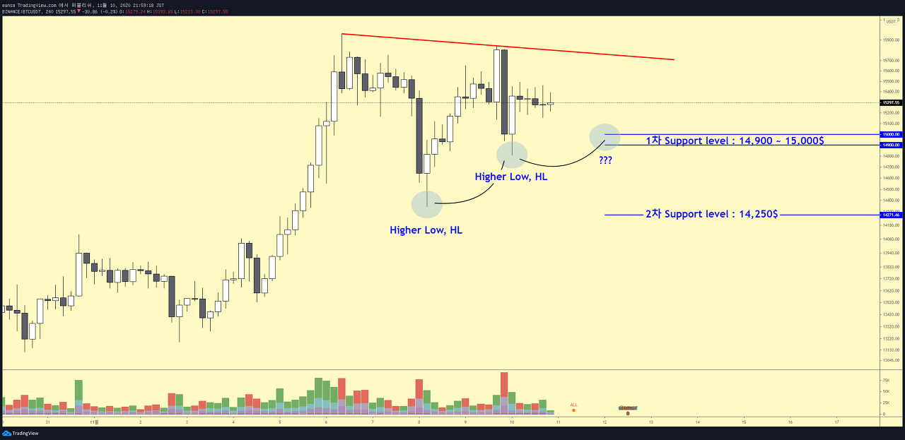 전일 브리핑을 안내드리고, 14,800$까지 단기조정이 완료가 되었습니다