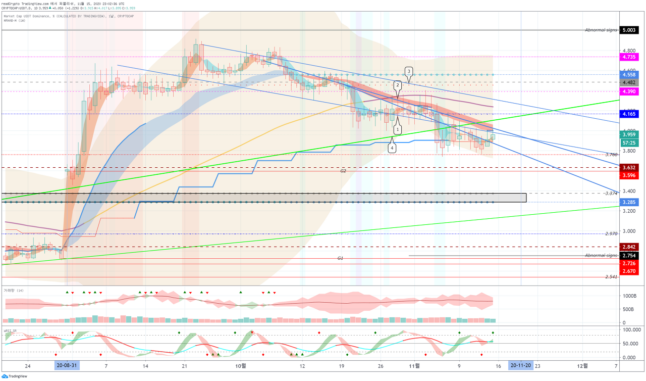 wRSI_SR 지표를 보면 단기적인 하락 추세가 나오고 있지만, 하락 추세가 시작되었다고 말하기에는 아직 추세가 살아 있습니다.