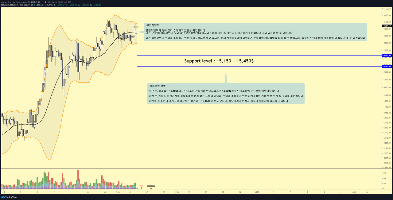 이번주, 최소한의 단기조정 예상치는 15,150 ~ 15,450$로 보고 있으며, 해당가격대 안착시 시장의 재확인이 필요할 것입니다