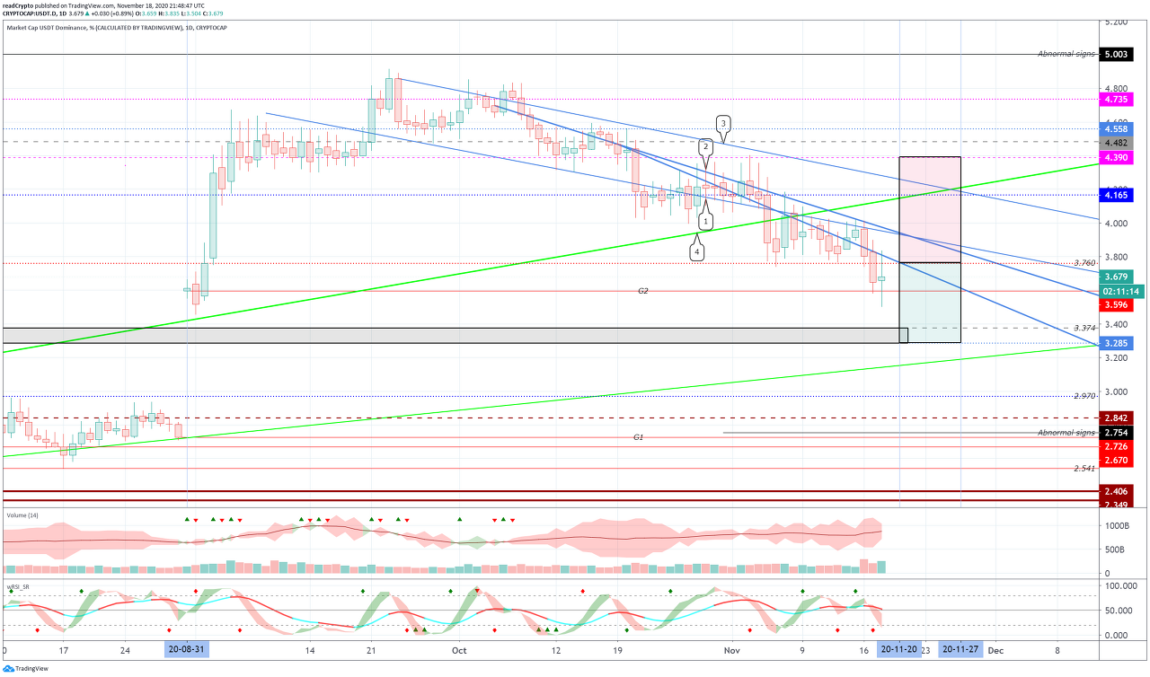 USDT 도미넌스가 하락한다면, 코인 시장에서 코인을 매수하는데 사용되거나 자금이 인출되고 있는 것으로 예상됩니다.