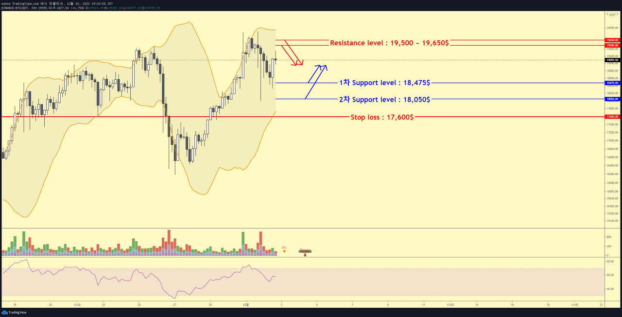 주요한 저항레벨은 19,500 ~ 19,650$로 보이며, 20,000$ 돌파하지 않는다면 해당 저항레벨 부근에서 조정이 재차 진행되며 박스권이 진행될 가능성이 높아보입니다
