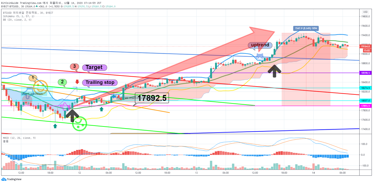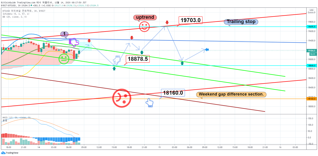 롱포지션 최대 목표가는 표시해드린 19703불 (추적손절매활용)