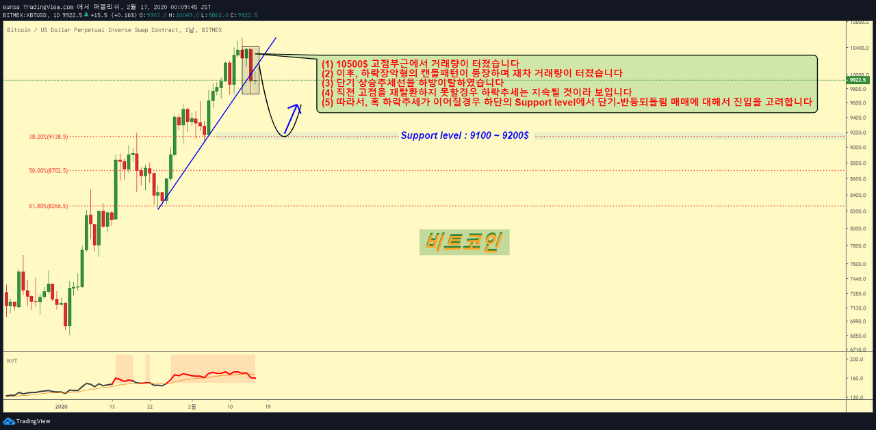 (6) 9700$ 하방 이탈 및 확정된다면, 하락추세는 급격한 가속도를 밟을 것으로 판단됩니다