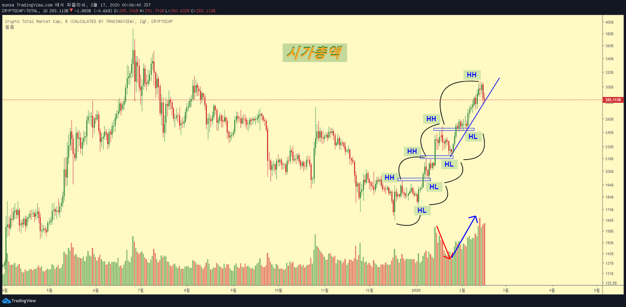 (1) 전체 암호화폐 시가총액의 흐름이, Dow-Theory(다우이론)을 따르며 교과서적인 움직임을 이제껏 보여주었습니다