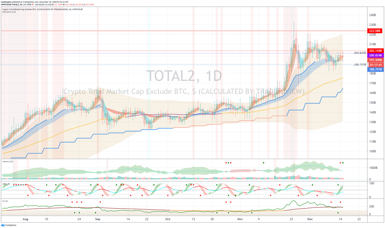 아래의 차트들을 살펴보면, TOTAL2 차트, 즉, 메이저코인들의 가격이 좀 더 하락해 있다는 것을 알 수 있습니다.