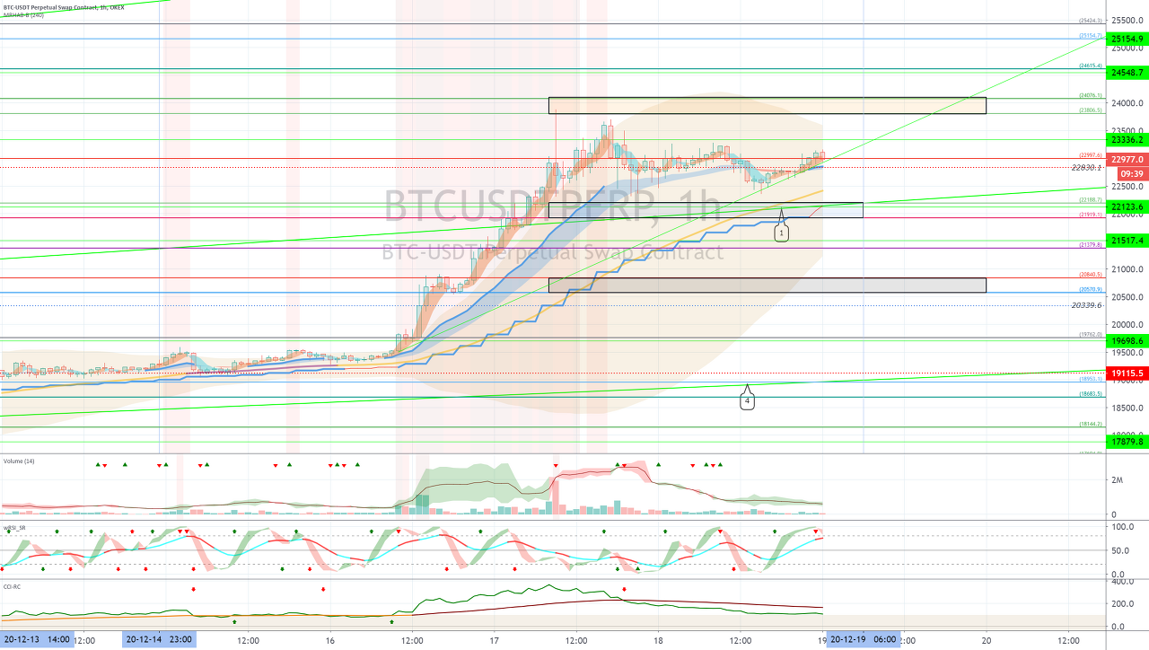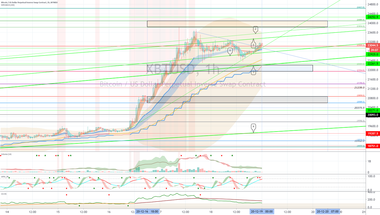 12월 21일경의 변동성으로 상승 추세선 (1)을 따라 상승하여 24252.5 지점을 돌파하기 위한 시도가 나오는지 지켜봐야 합니다.